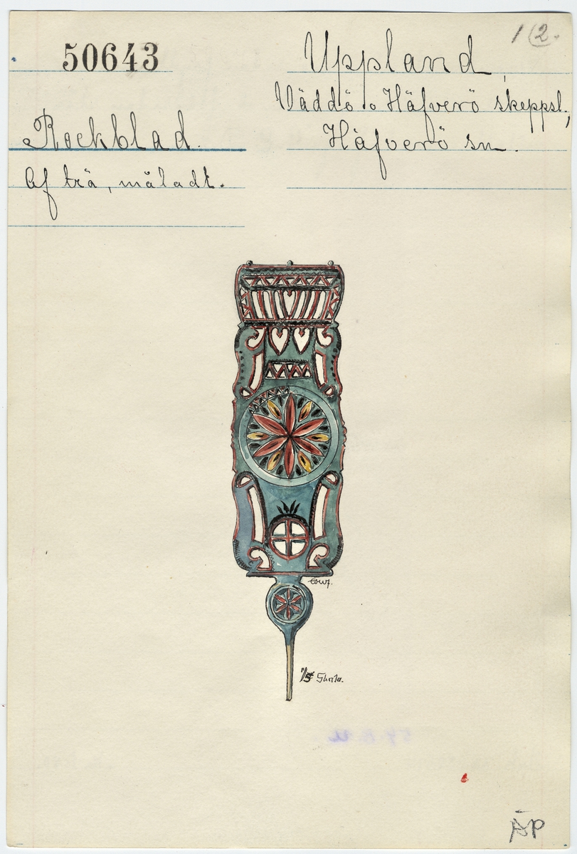 Katalogiseringskort, så kallad kataloglapp, från Nordiska museet. Föremål inv.nr 50643, rockblad från Uppland. Akvarell av Emelie von Walterstorff.