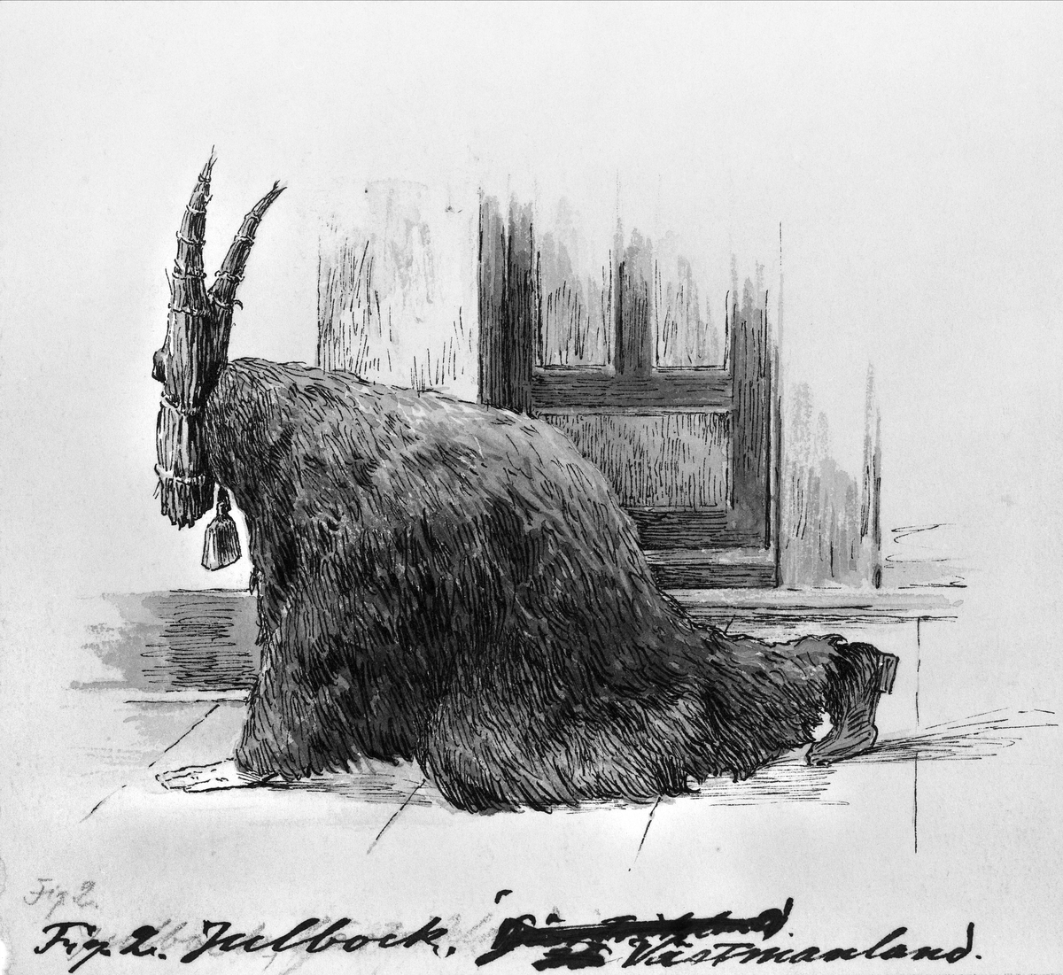 Julbock sedd snett bakifrån. Den utklädda julbocken spelade en viktig roll i upptågen under julen.