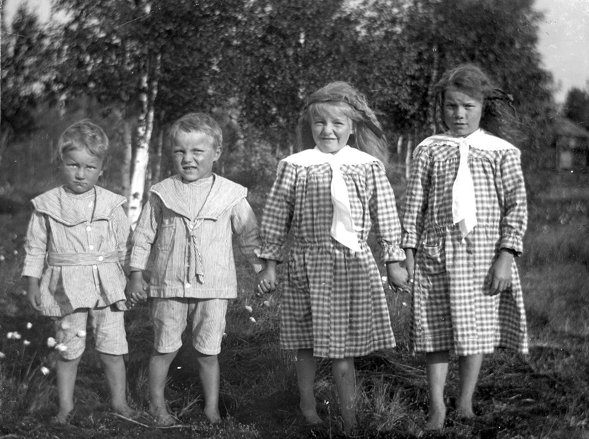 Gruppbild av fyra barn. Två pojkar i likadana randiga dräkter med sjömanskrage och korta byxor. Två flickor i likadana rutiga klänningar med vita kragar.
