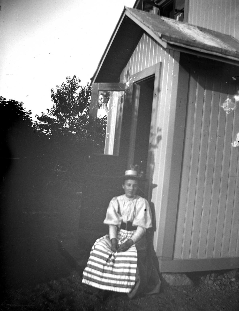 Porträtt av en kvinna i vit blus med fårbogsärmar, mörk kjol och randigt förkläde som sitter på en trappa.