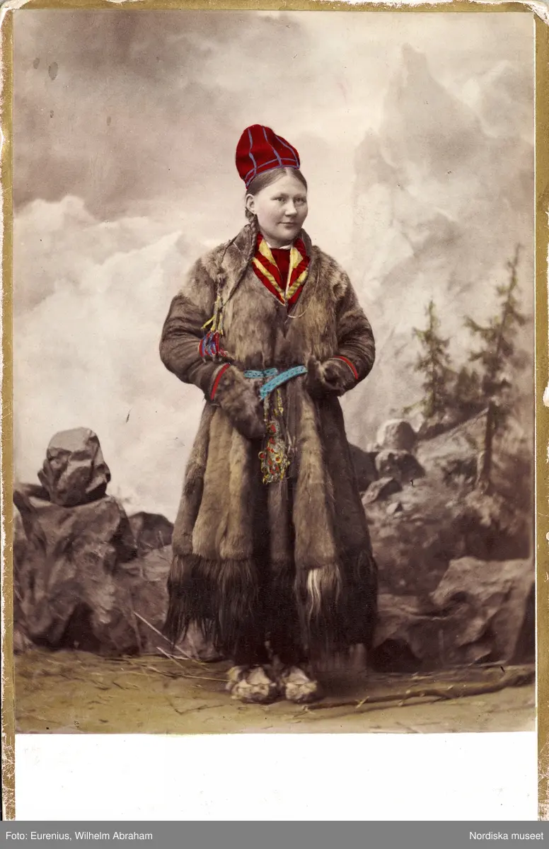 Ateljébild. Porträtt av kvinna i samisk dräkt. Handkolorerad.