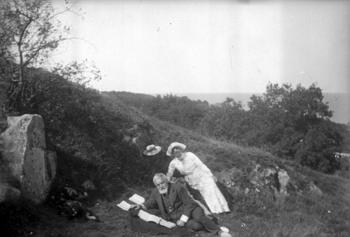 Ett par sitter på marken . Mannen har två böcker framför sig på en filt.