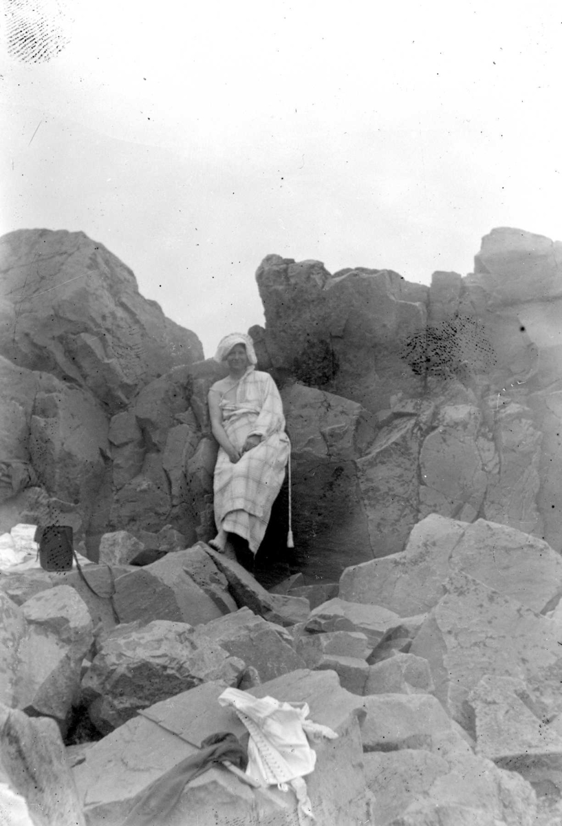 En kvinna med badkappa och mössa sitter på en klippa. På stenarna bredvid henne ligger en väska och klädesplagg, bl.a en korsett.
