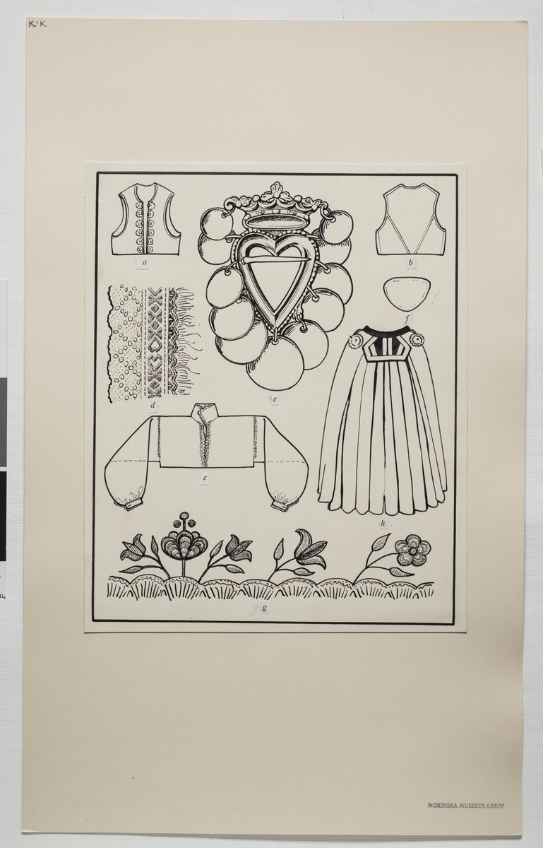 Festdräkt för gift kvinna. Värend, Småland. Teckning av Emelie von Walterstorff.
