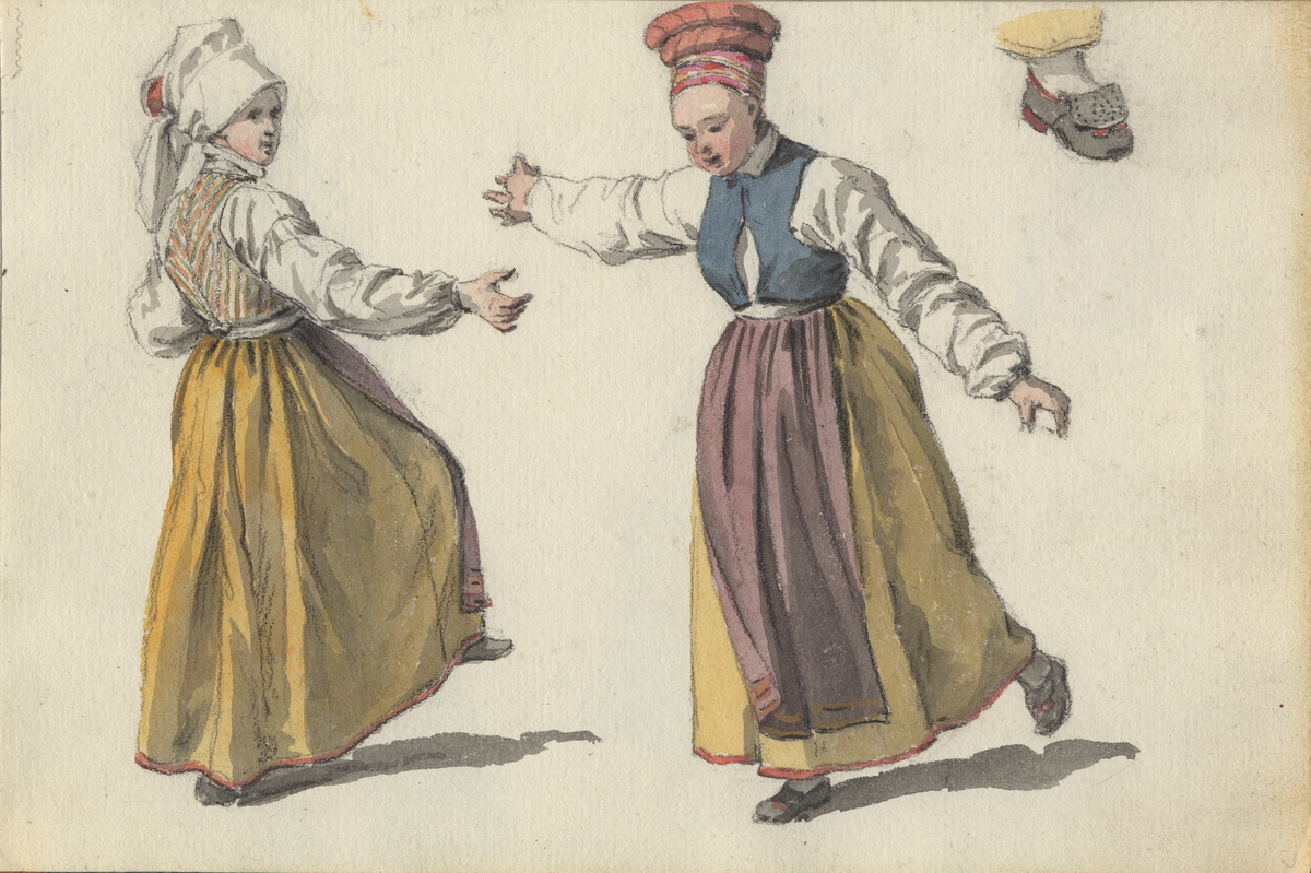 Akvarell. Dräktskiss. Två dansande kvinnor /flickor i folkdräkt i helfigur. Detaljskiss av den enas sko. Skiss ur skissbok ur Johan Gustaf Sandbergs arkiv, Nordiska museet INV.NR: NM.0080508.