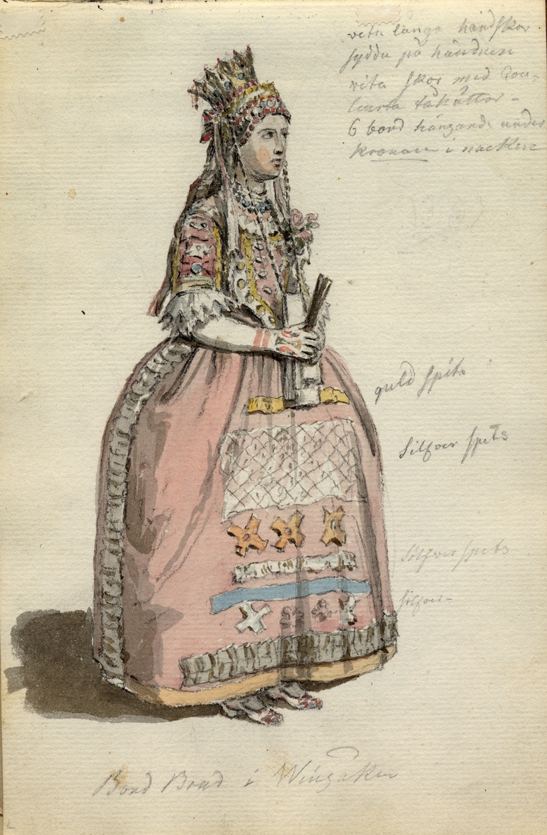 Akvarell. "Bond Brud i Wingåker". Kvinna i bruddräkt med krona. Text: "Vita långa handskar, sydda på ....(?)" Skiss ur skissbok ur Johan Gustaf Sandbergs arkiv, Nordiska museet INV.NR: NM.0080508.