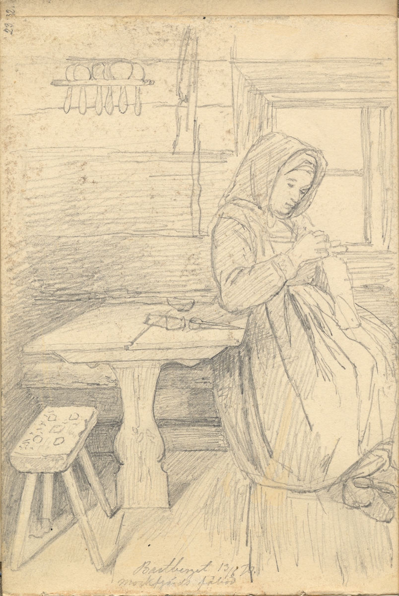 Blyertsskiss. Interiör. Bastberget 13/6 Mockfjärds fäbod. En kvinna sitter invid ett fönster och handarbetar. Ur Skissbok av A. J.G. Virgin