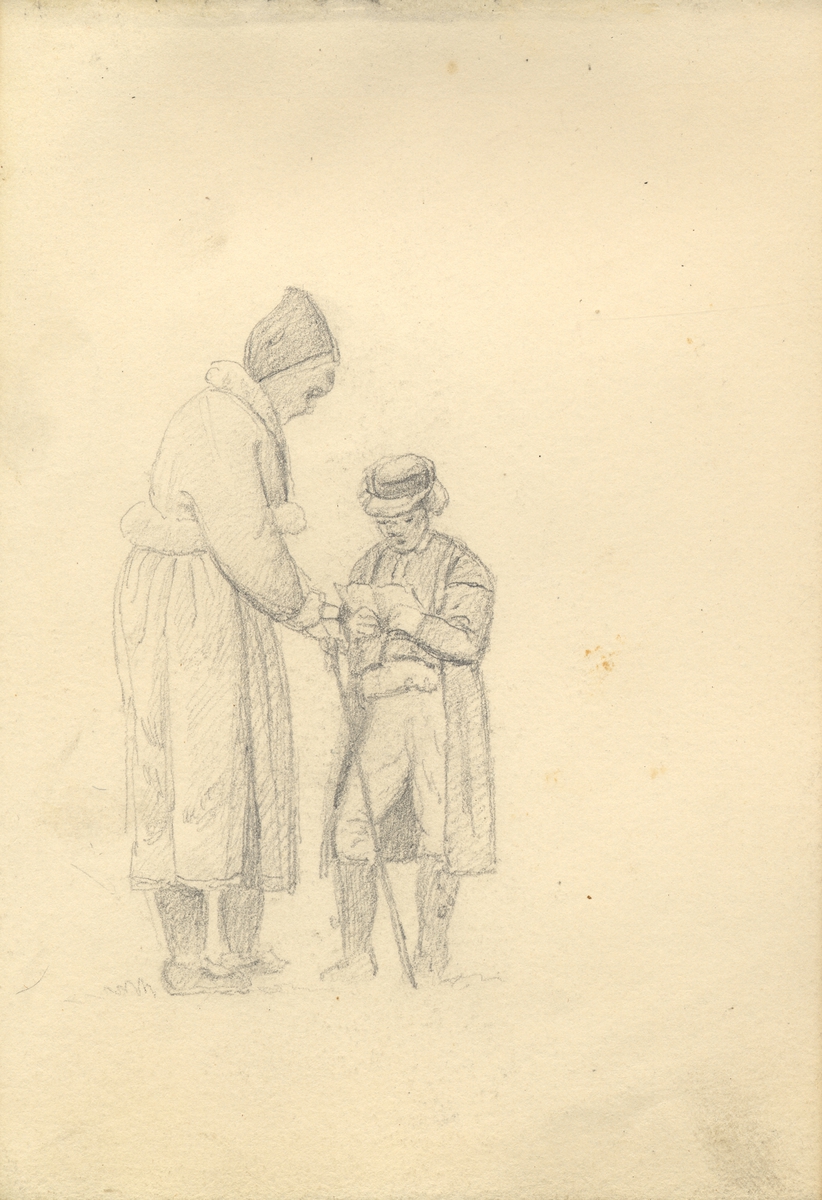 Blyertsskiss. Rättvikskvinna i skinnkläder och pojke. Ur Skissbok av A. J.G. Virgin