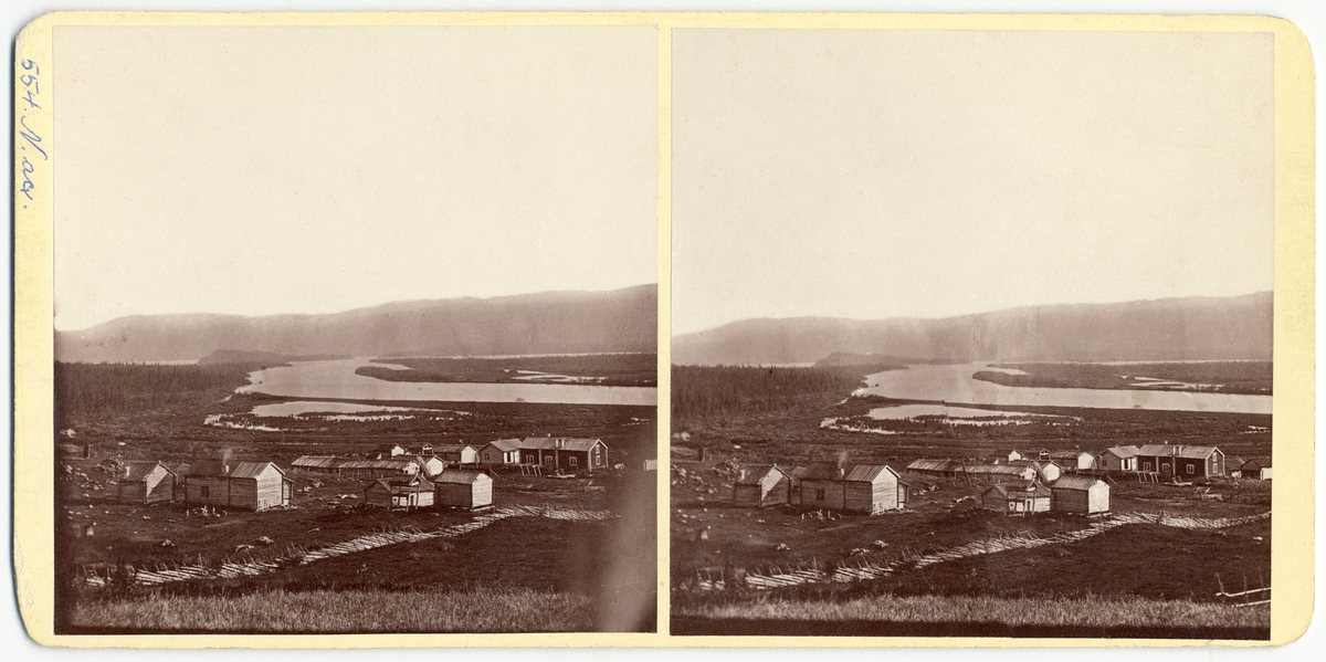 Stereoskopbilder med vy över Lappländskt landskap. Några byggnader i förgrunden, troligen Klockargården. I bakgrunden Tarras och Kamajokkforsens vatten. En glimt av Saggatsjön med Storholmen. I fonden Lastak.