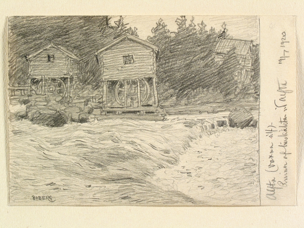 Hälsingland, Alfta sn. Voxna älv. "Ruiner af linskäktor vid Alfta". Teckning av Ferdinand Boberg