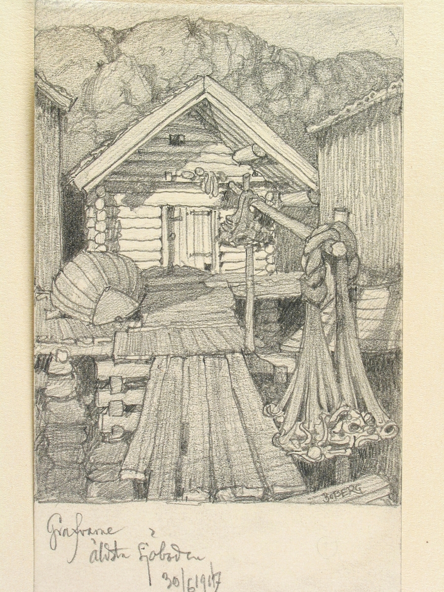 Bohuslän, Gravarne. "Äldsta sjöboden". Teckning av Ferdinand Boberg