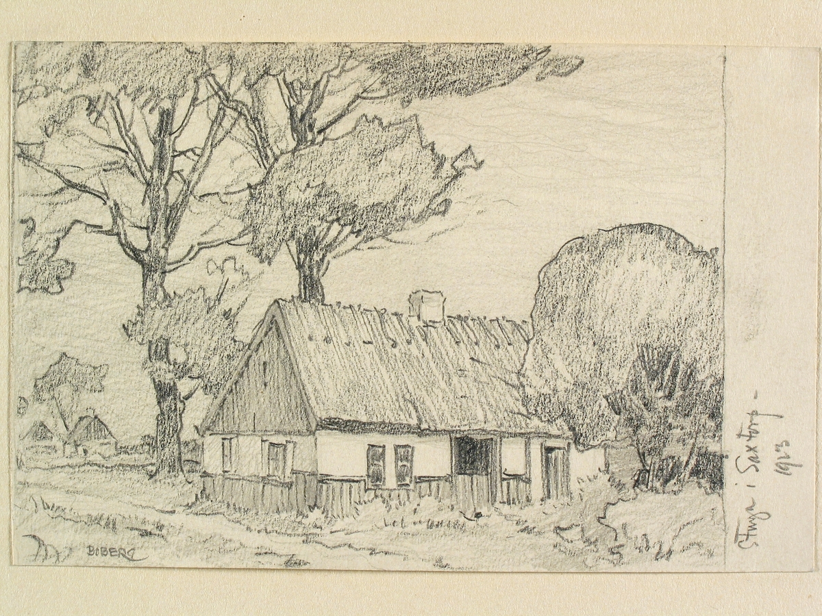 Skåne, Harjagers och Rönnebergs härader. Stuga i Saxtorp. Teckning av Ferdinand Boberg