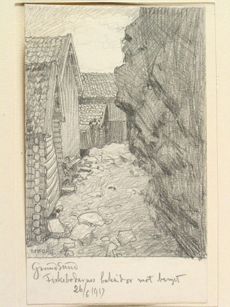 Bohuslän, Grundsund. Fiskebodarnas baksidor mot berget. Teckning av Ferdinand Boberg