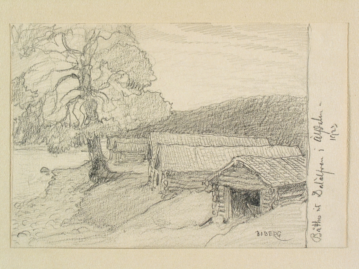 Dalarna, Älvdalens sn. Båthus vid Dalälven. Teckning av Ferdinand Boberg