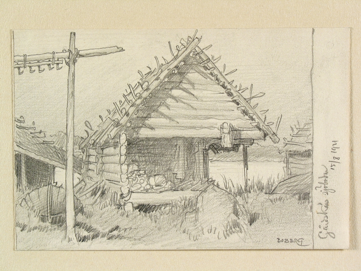 Uppland, Örbyhus , Älvkarleby sn. Gårdskärs sjöbodar. Teckning av Ferdinand Boberg