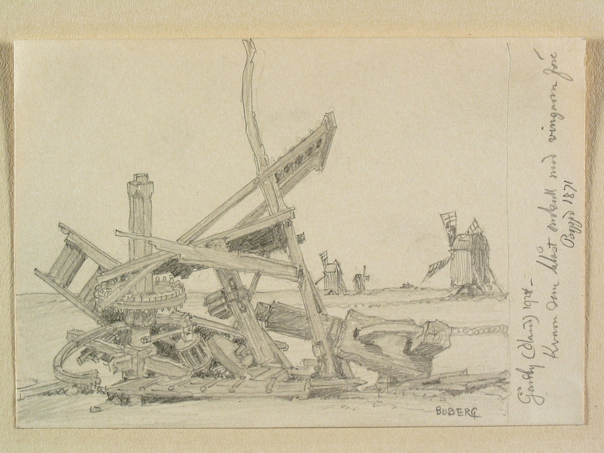 Öland, Möckleby hd., Gårdby. "Kvarn som blåst omkull med vingarna före (byggd 1871)." Teckning av Ferdinand Boberg.