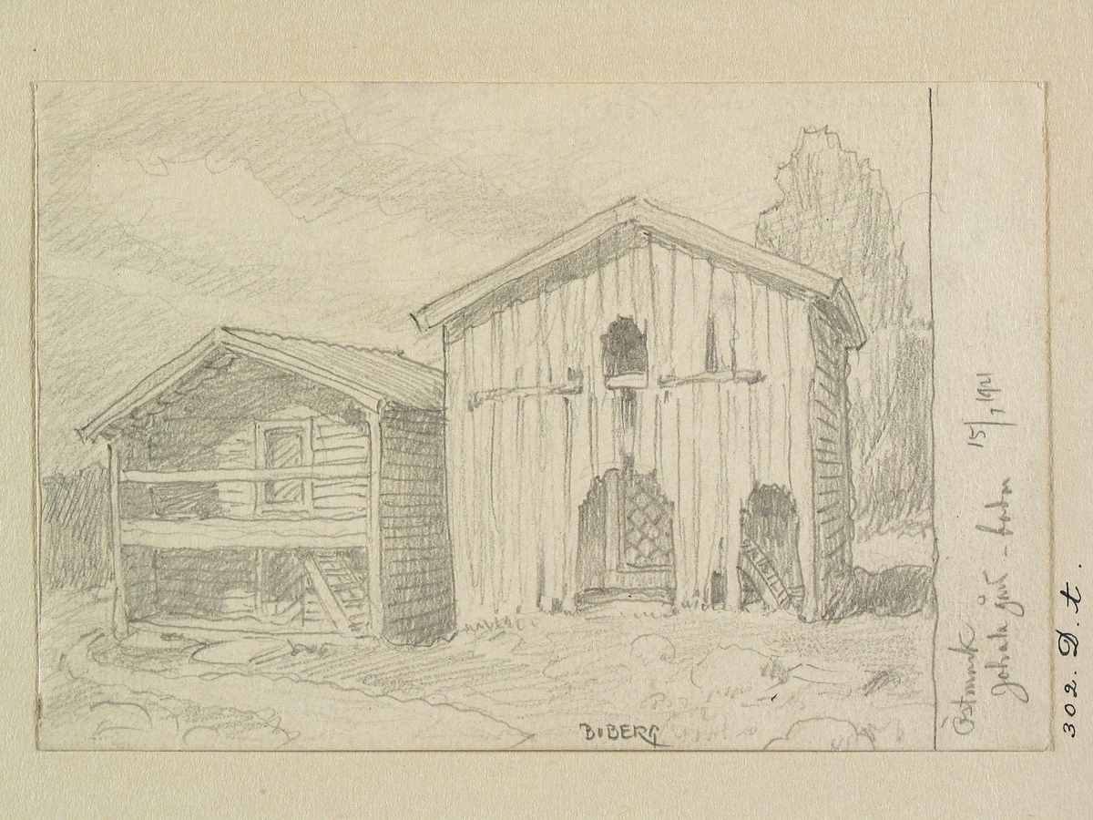 Värmland, Fryksdals hd., Östmarks sn. Bodar på Johala gård. Teckning av Ferdinand Boberg
