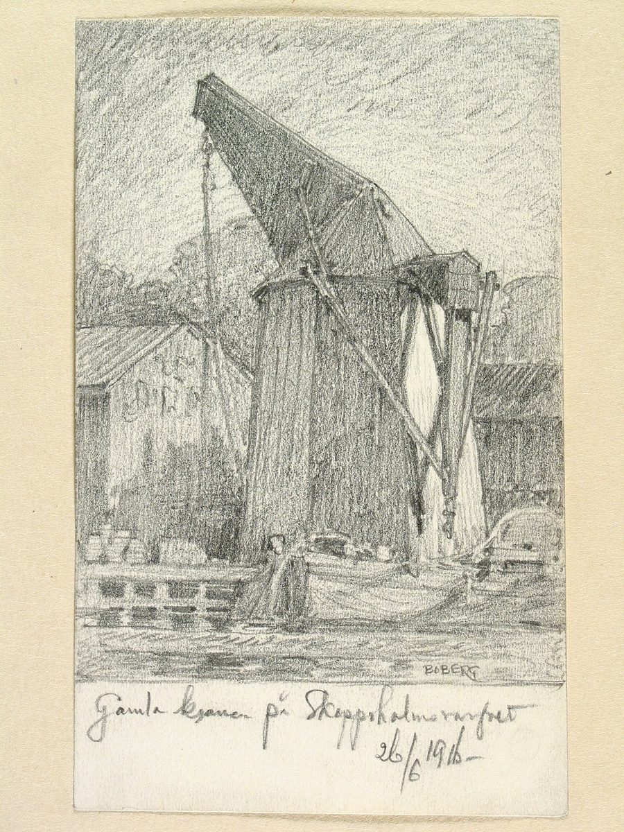 Teckning av Ferdinand Boberg. Stockholm, Norrmalm, Skeppsholmen. Texten lyder: "Gamla kvarnen på Skeppsholmsvarfvet 6/6 1916". Kvarnen är idag byggnadsminne och enligt Statens Fastighetsverk en styckekran som använts för att lyfta kanoner.