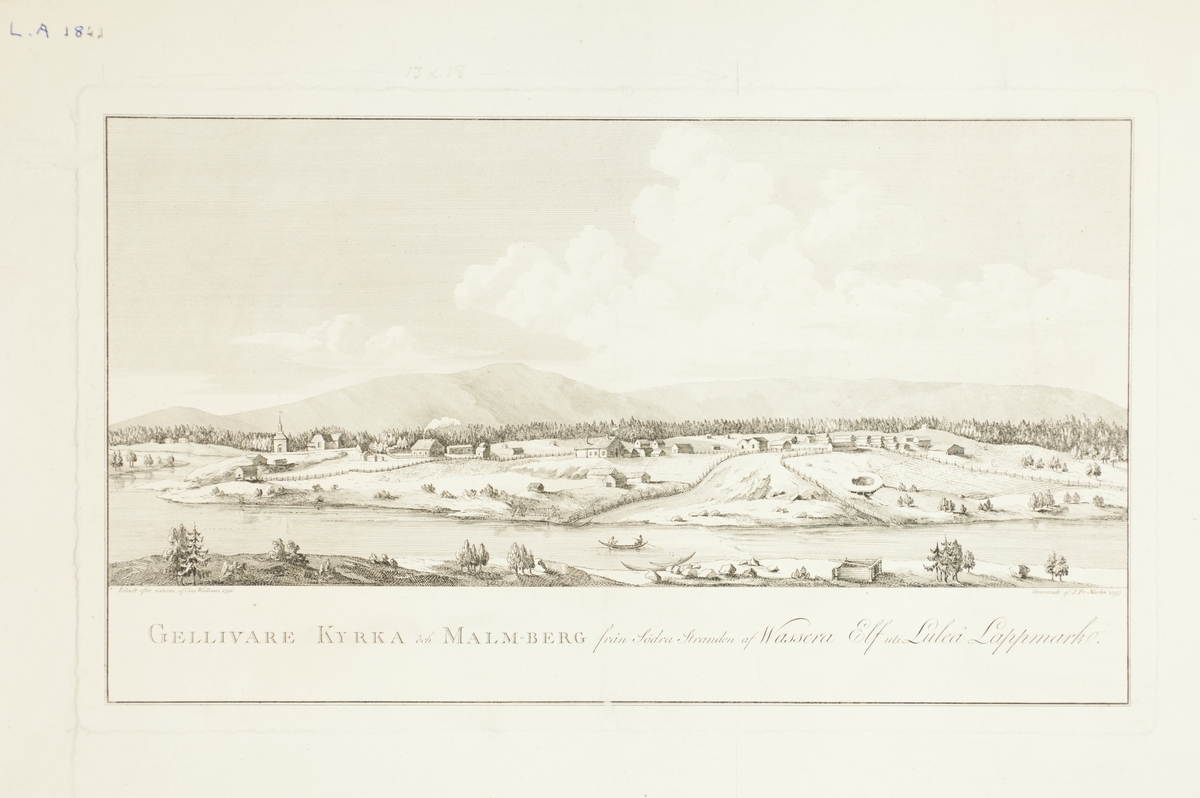Gravyr av Johan Fredrik Martin 1797. "Gellivare Kyrka och Malm-berg från Södra Stranden af Wassera Elf uti Luleå Lappmark. Ritadt efter naturen af Clas Wallman 1796." Vy över älven och landskapet. L. A. 1841