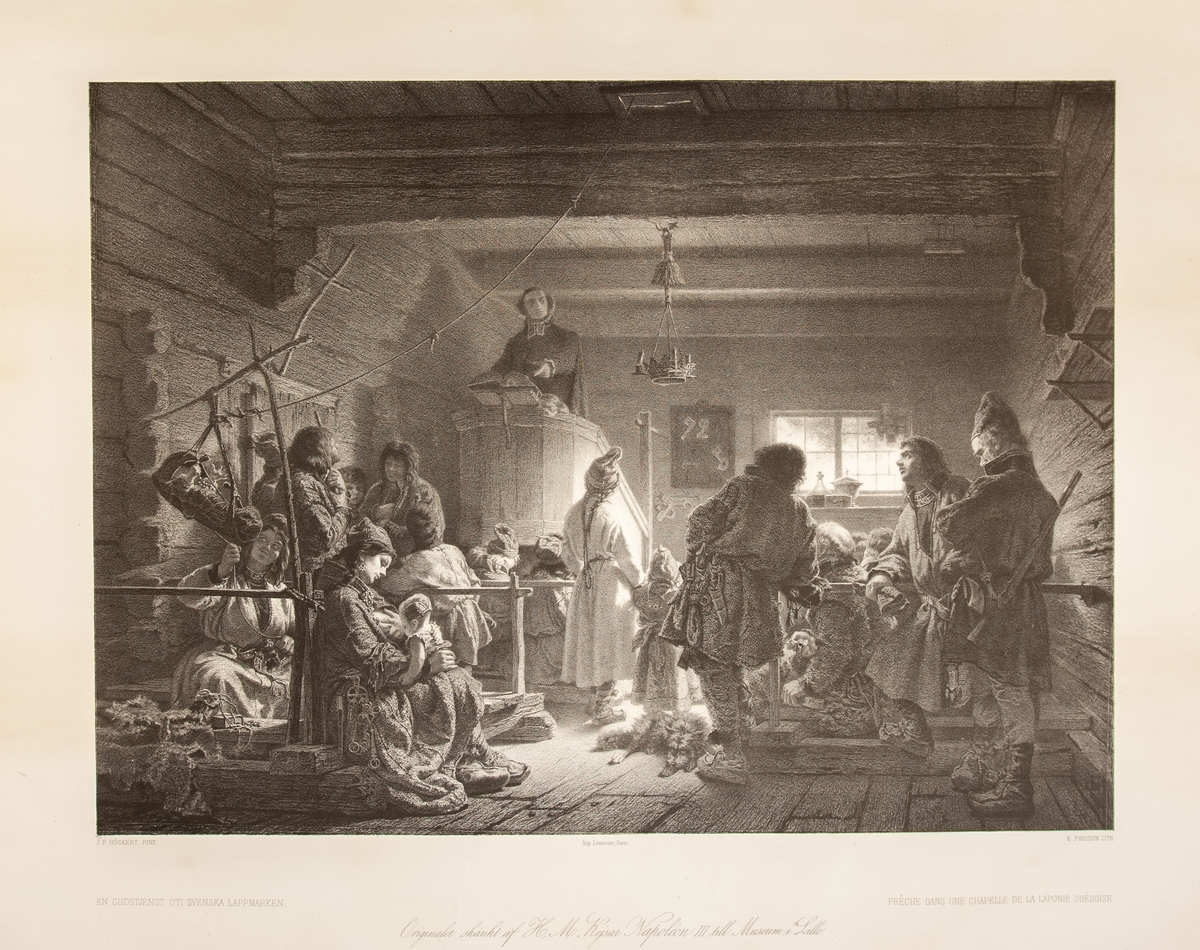 Grafiskt tryck efter Johan Fredrik Höckerts målning Gudstjänst i Lövmokks fjellkapell, 1855. Den samiska kvinnan med barnet till vänster på bild hade en modell i Frankrike, Lusiella. Den ursprungliga oljemålningen köptes av Napoleon III efter Parissalongen 1855. L.A. 1428.