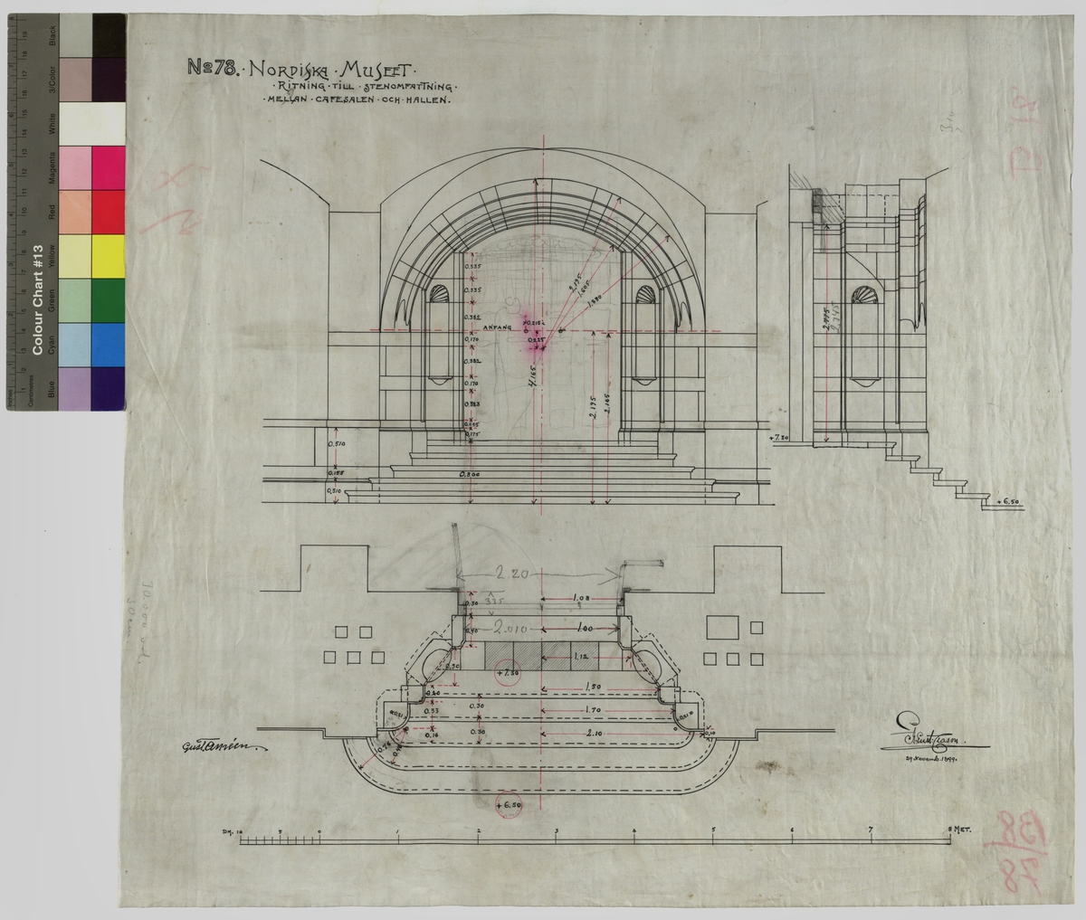 Ritning på väv över Nordiska museets huvudbyggnad. Ritning till stenomfattningar mellan cafésalen och hallen. Konstruktion, Plan. Dörr, Hallplanet. 45x48,5 cm. Tusch och blyerts. Linjalritning. I Gust Clason 29 november 1899. Gust Améen.