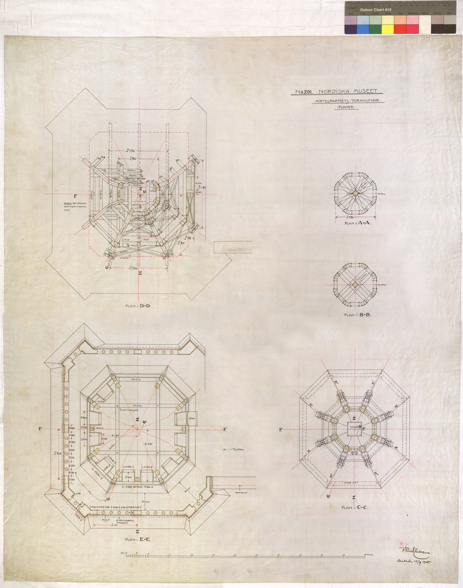 Ritning på väv över Nordiska museets huvudbyggnad. Mittenpartiets tornhuvar. Planer i olika nivåer. Konstruktion. Tornhuv. 99,5x 83,5 cm. Tusch, rött, och gult. Linjalritning. I Gust Clason Stockholm 15 september 1905.