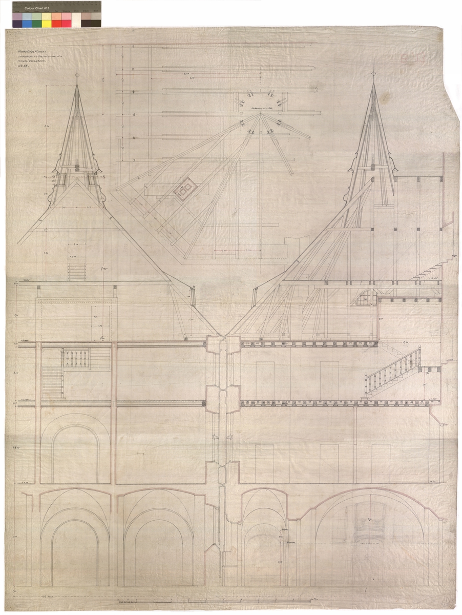 Ritning på väv över Nordiska museets huvudbyggnad. Skärningar och takstolsplan till kanslibyggnaden. Sektion. Plan. Kanslibyggnaden, tak.Tusch, brunt, grått. Linjalritning. Osignerad.