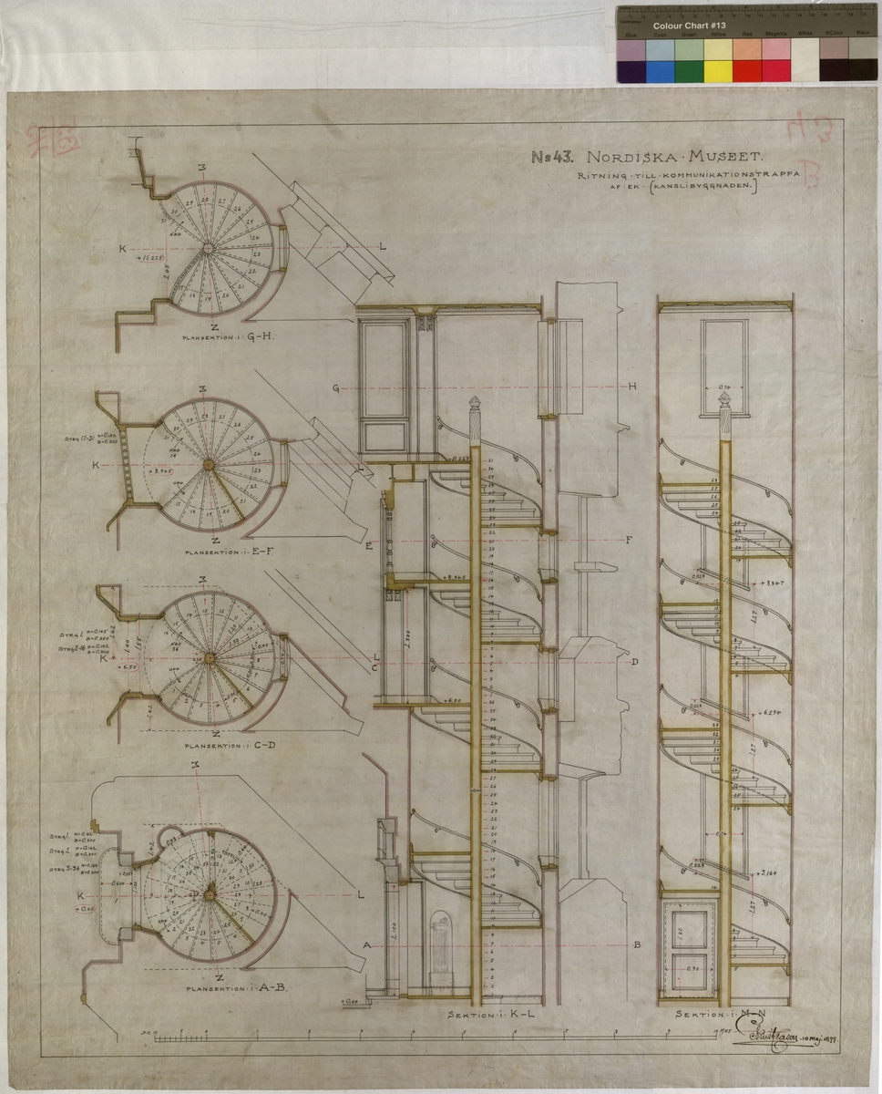 Ritning på väv över Nordiska museets huvudbyggnad. Ritning till kommunikationstrappa av ek (kanslibyggnaden).Sektion, Plan. Vindeltrappa, Kanslibyggnaden. 78x 68 cm. Tusch och rött. Linjalritning. I Gust Clason 10 maj 1899.