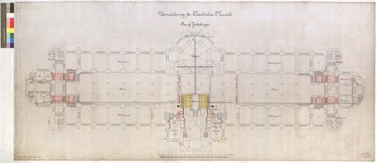 Värmeledning för Nordiska museet. Plan över jordvåningen. Installationsritningitning, värmeledning, jordvåning. 72x162 cm. Tusch, rött, gult. Linjalritning. "No 4455. Den 19 December 1906". Stämplad "Wilhelm Dahlgren Ingeniör Stockholm"