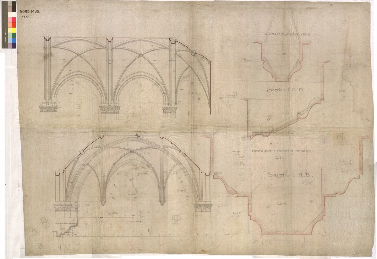 Ritning på väv över Nordiska museets huvudbyggnad. Normalskärning i E-F. Sektion i C-D. Sektion A-B. Detaljer i naturlig storlek. Konstruktion. Valvstrålar. 107x 149 cm.Tusch, rött oh brunt. Linjalritning. Osignerad