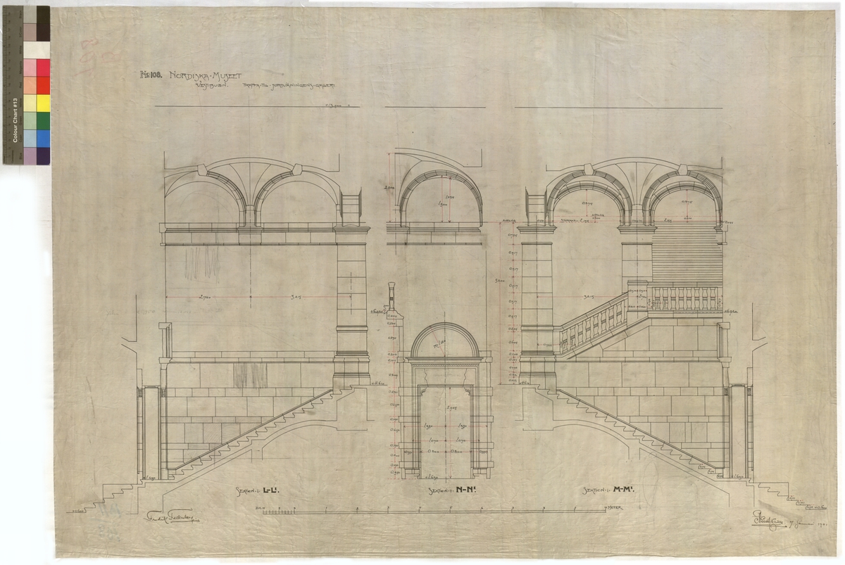 Ritning på väv över Nordiska museets huvudbyggnad. Vestibulen. Trappa till jordvåningens galleri. Sektion. Vestibulen, jordvåningens trappa. 70x100 cm. Tusch och rött. Linjalritning. I Gust Clason 7 Februari 1901. Fredrik Falkenberg.