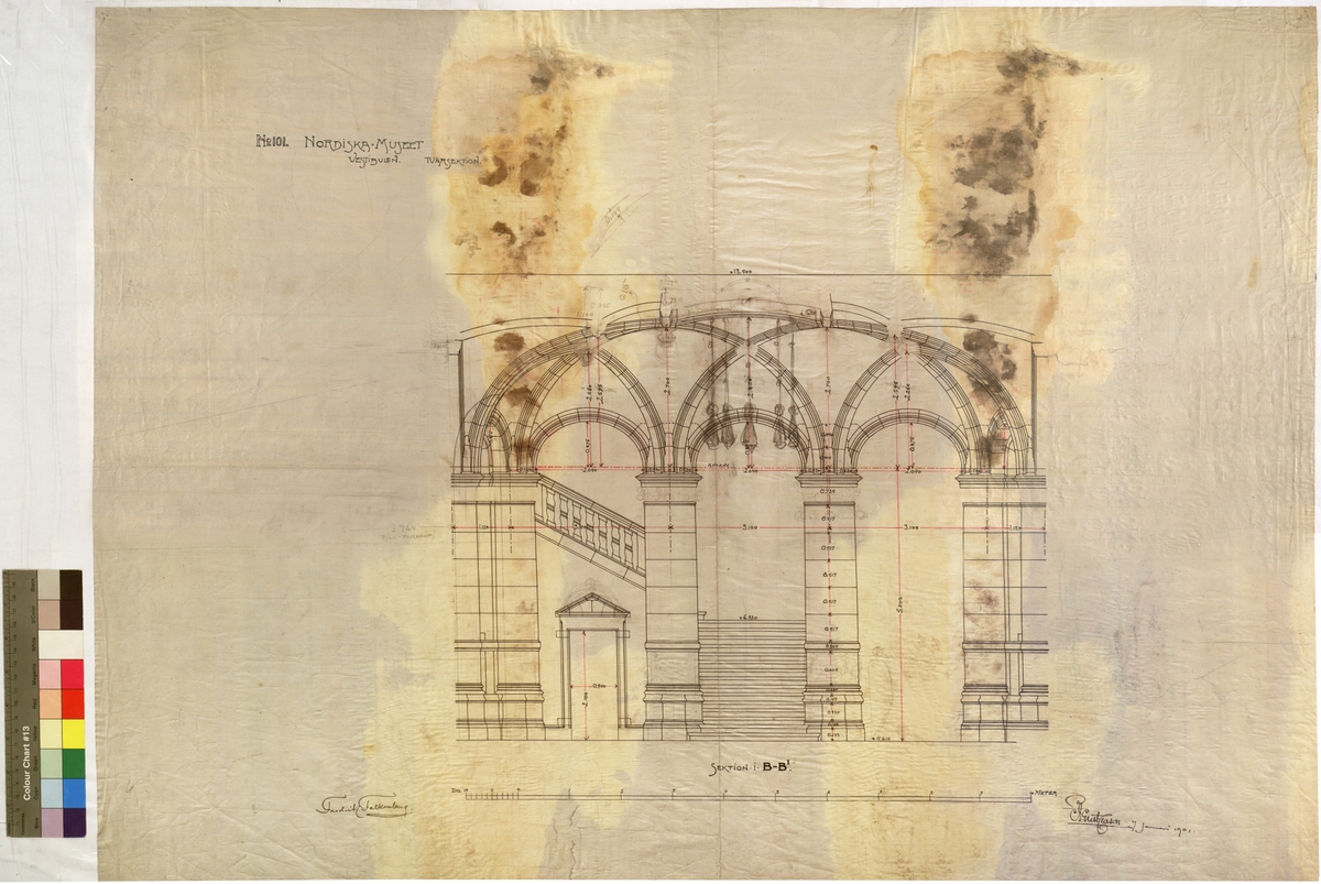 Ritning på väv över Nordiska museets huvudbyggnad. Vestibulen. Tvärsektion. Sektion. Vestibulen. 70x99 cm. Tusch och blyerts. Linjalritning. I Gust Clason 7 Januari 1901. Fredrik Falkenberg.