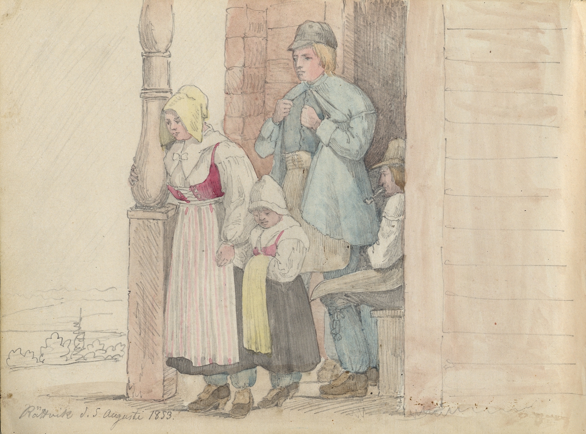 Färglagd blyertsskiss. Grupp. En kvinna ett barn och två män på en förstukvist. "Rättvik d 5 augusti 1853". Ur skissbok märkt G.V Palm, Nordiska museets arkiv.