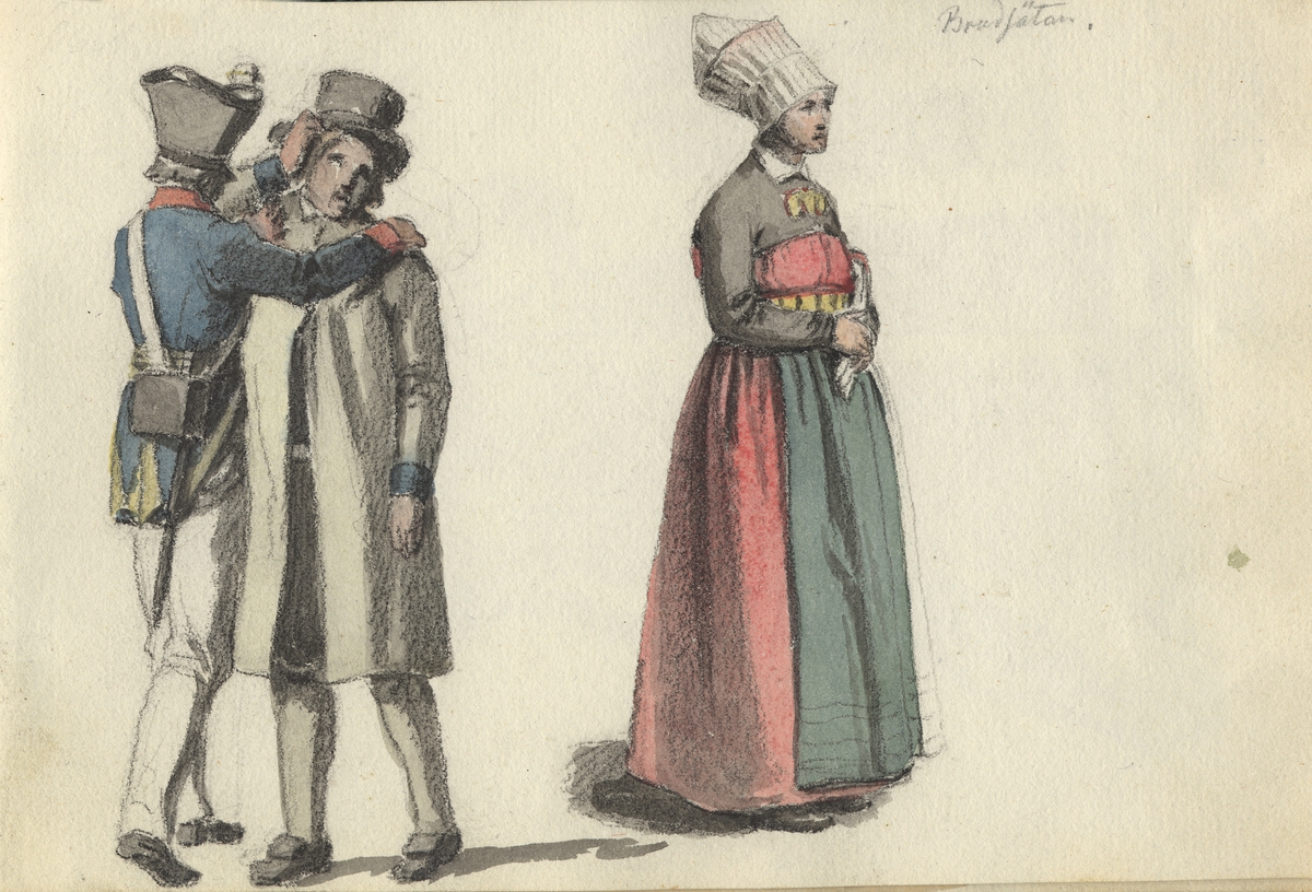 Akvarell. Dräktskiss Två män och en kvinna i helfigur. Soldat i uniform längst tv med ryggen mot betraktaren och händerna på en annan mans axlar. Mannen th är klädd i vit dräkt. Kvinna t.h i bild Skiss ur skissbok ur Johan Gustaf Sandbergs arkiv, Nordiska museet INV.NR: NM.0080508.