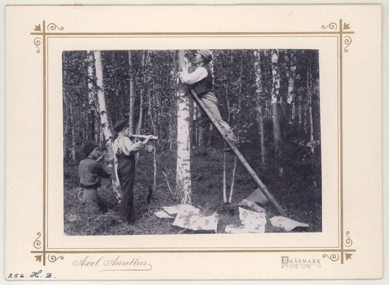 Dokumentation av skogsbruk i Lekvattnet i Värmland. Två män och en pojke arbetar med nävertäkt. En av männen står på stege, båda river näver från björkstammar. Pojken har rullat näver som han blåser i - som i en flöjt.