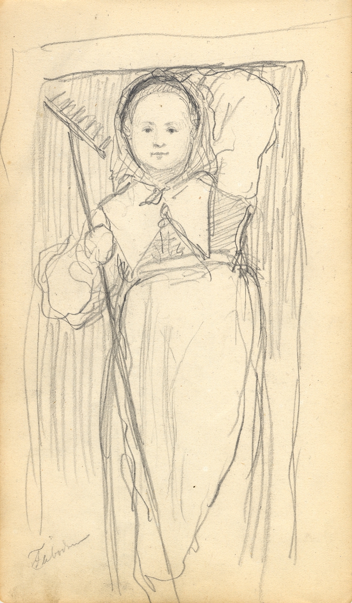 Blyertsskiss. Fäbodarna. Flicka liggandes med räfsa Floda. Ur J.A Malmströms skissböcker.