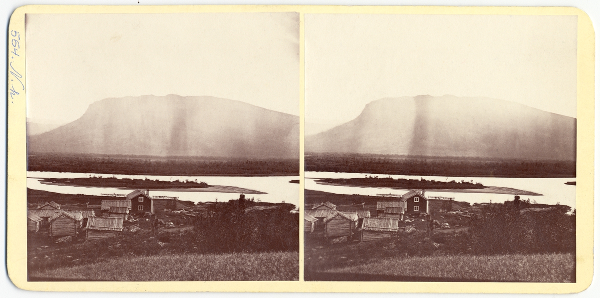 Stereoskopbilder med vy över Lappländskt landskap. Några byggnader i förgrunden, troligen Prästgården. I bakgrunden Kamajokkforsens vatten och Krutholmen. I fonden berget Nammatj.