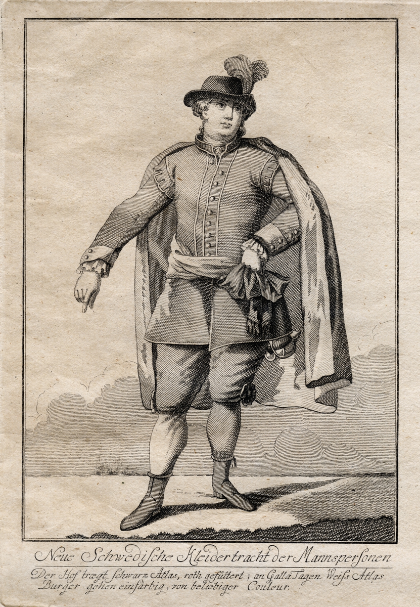 Gustaf III:s nationella dräkt. "Neue Schwedische Kleidertracht der Mannspersonen." Herre i svenska dräkten. Gravyr av okänd kostnär, trol. ca 1780.