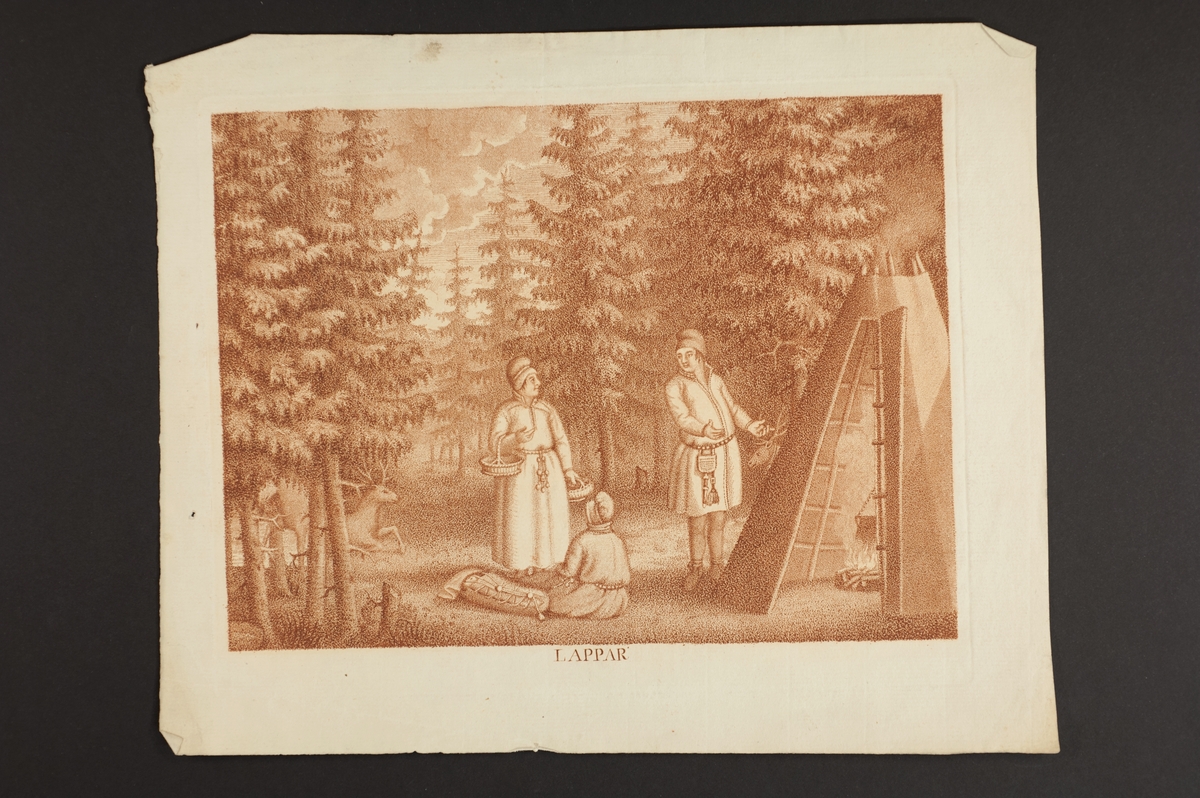Gravyr av Fredrik Erik Martin efter förlaga av Pehr Hilleström från omkring 1800. En samisk familj utanför en kåta i skogen, renar bland träden. L.A. 1044. Jämför NMA.0103224.