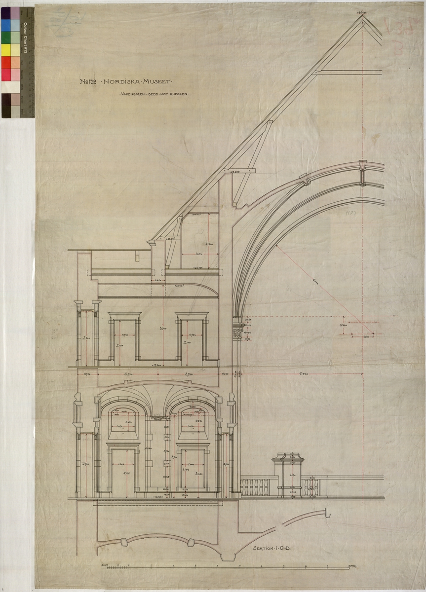 Ritning på väv över Nordiska museets huvudbyggnad. Vapensalen sedd mot kupolen. Sektion. Absiden, 1:a galleri omgång och 2:ra galleri omgång. 106x 70,5 cm. Tusch, rött, brunt, grått och gult. Linjalritning. Osignerad.