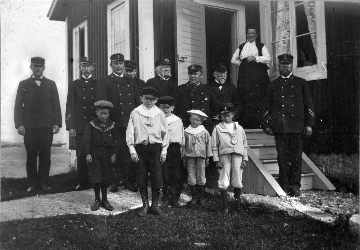 Lotsinspektion omkring 1890. Lots och fyrbetjäningen med barn. I Mitten Lotsverkets kaptener Dahlman, t.v. Berg och t.h. Bamberg. Sjömanskostymer.