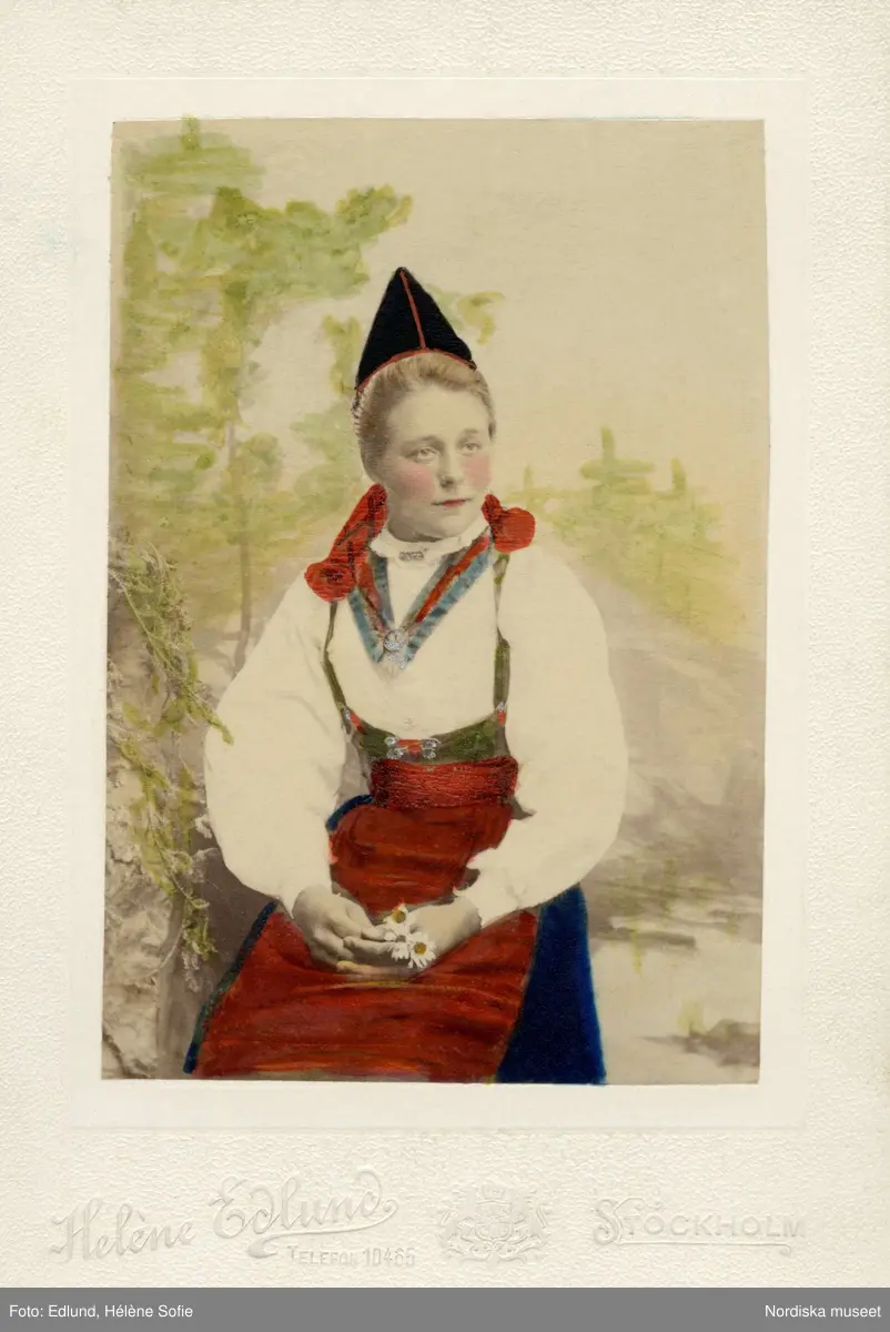 Ung flicka poserar i en folkdräkt från Rättvik i Dalarna. Kolorerat foto.