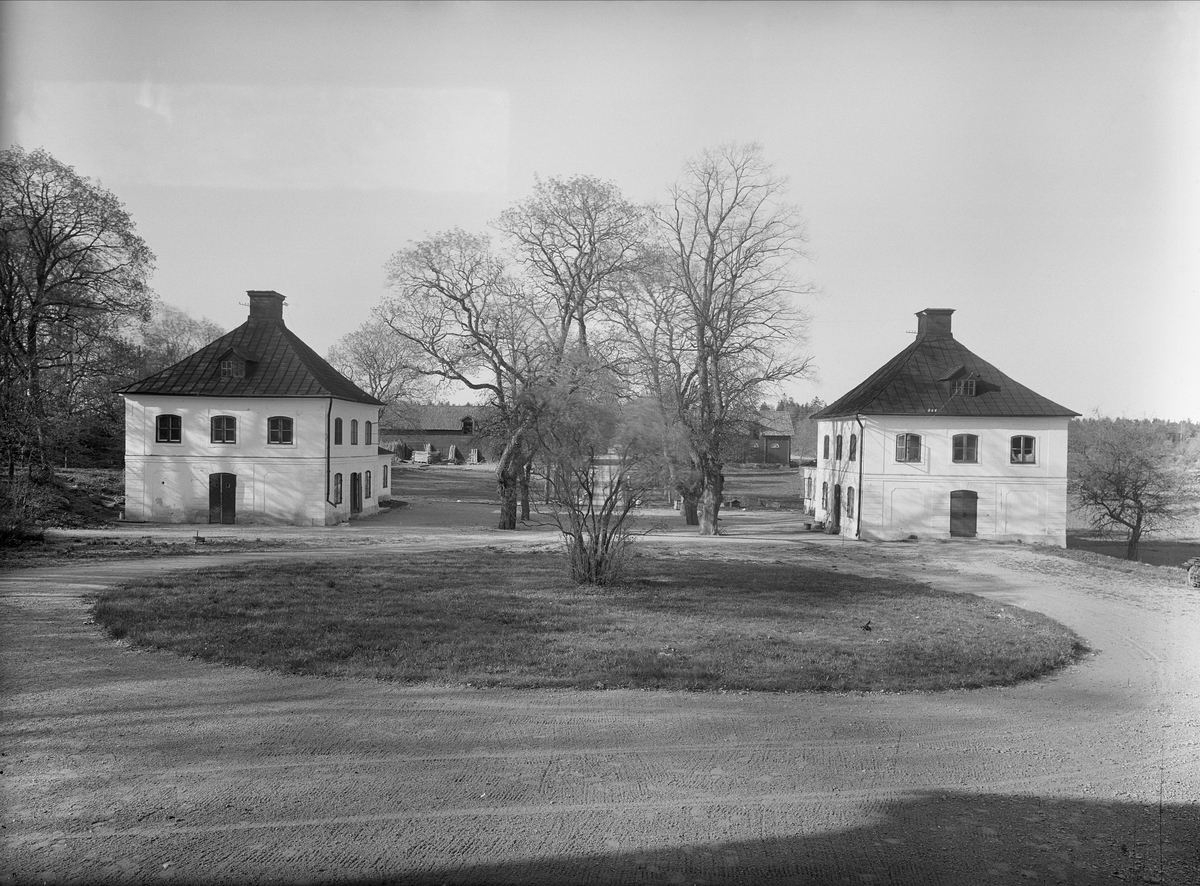 Åkeshof. Flyglarna och uppfarten från manbyggnadens port. På gårdsplanen en gräsbevuxen rundel. Bromma socken, Sollentuna härad, Uppland.