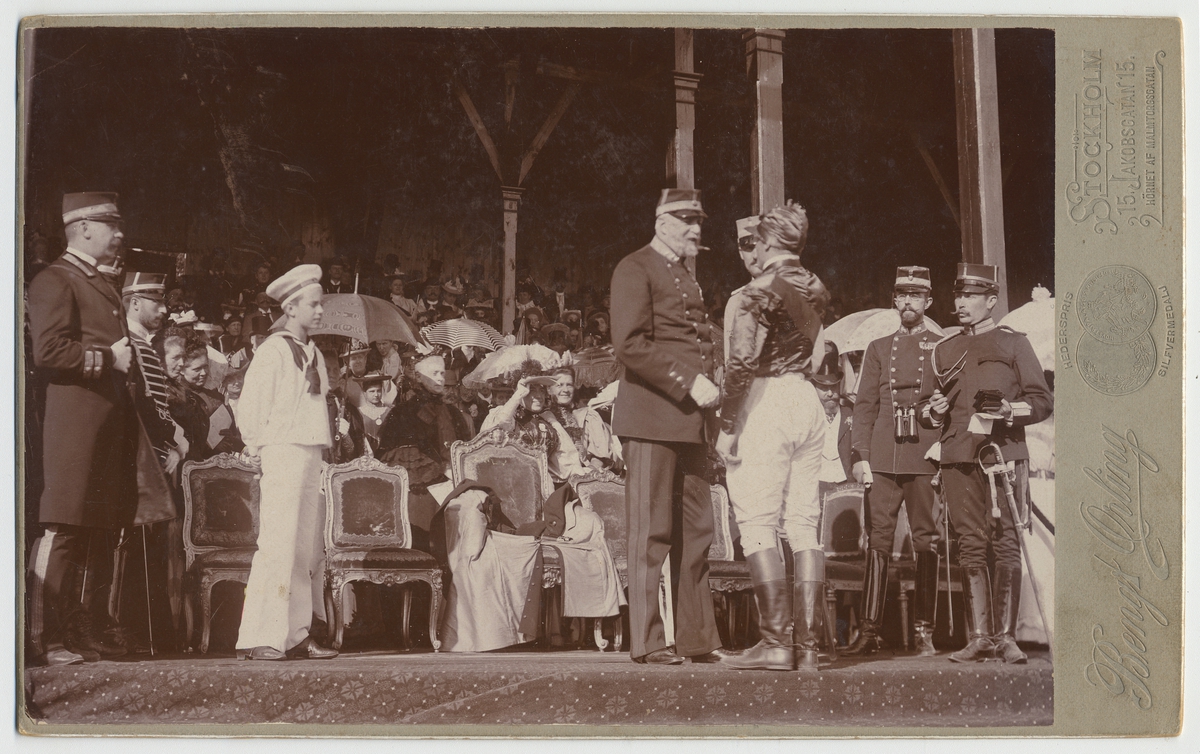 Oscar II hälsar på en jockey inför prins Eugen (2:a fr.v.), prins Carl, kronprins Gustaf m fl.
