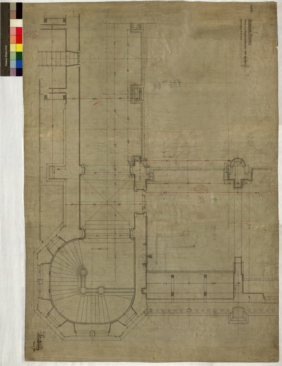 Ritning på väv över Nordiska museets huvudbyggnad. Plan till Allmogehallens 2dra galleri [Våningen 2 tr upp).Plan.I galleriet Norra tvärgången. 70x 99 cm.Tusch, brunt, rött. Linjalritning. I Gust Clason mars 1894.