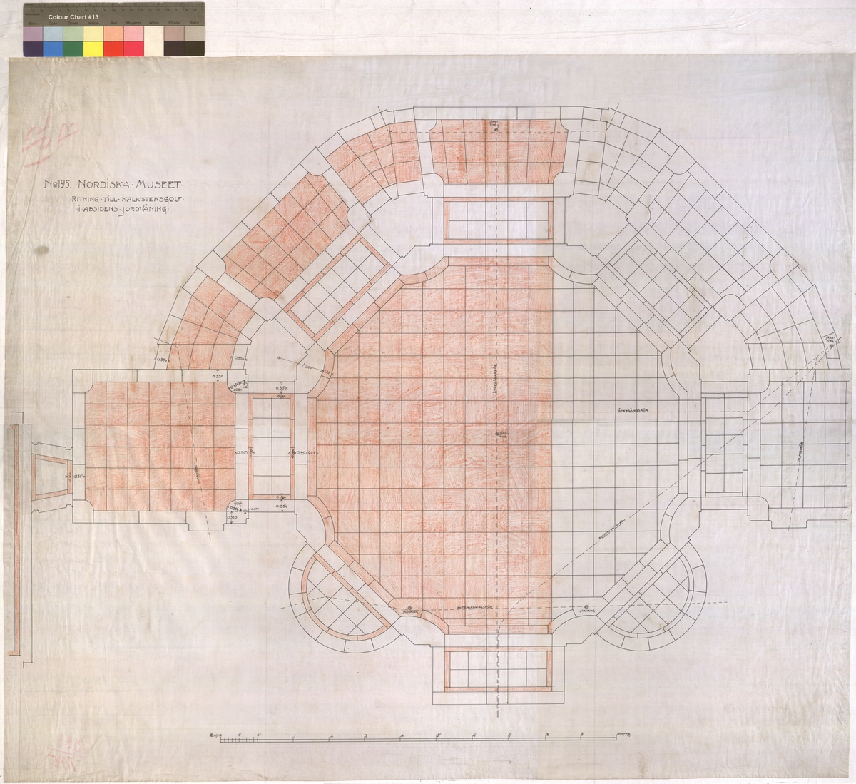 Ritning på väv över Nordiska museets huvudbyggnad. Ritning till kalkstensgolv i absidens jordvåning. Golv, absiden och jordvåning. Tusch och brunt. Osignerad.