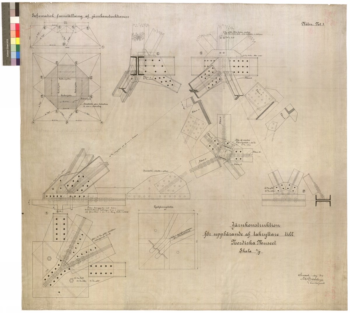 Järnkonstruktion för uppbärande av takryttare, schematisk framställningavf järnkonstruktionen. Ritning No 1. Skala 1/5. Konstruktionsritning, takryttare. 99 x 105 cm.Tusch. Linjalritning. "Stockholm i Maj 1903 Fritz Söderbergh civilingenjör".