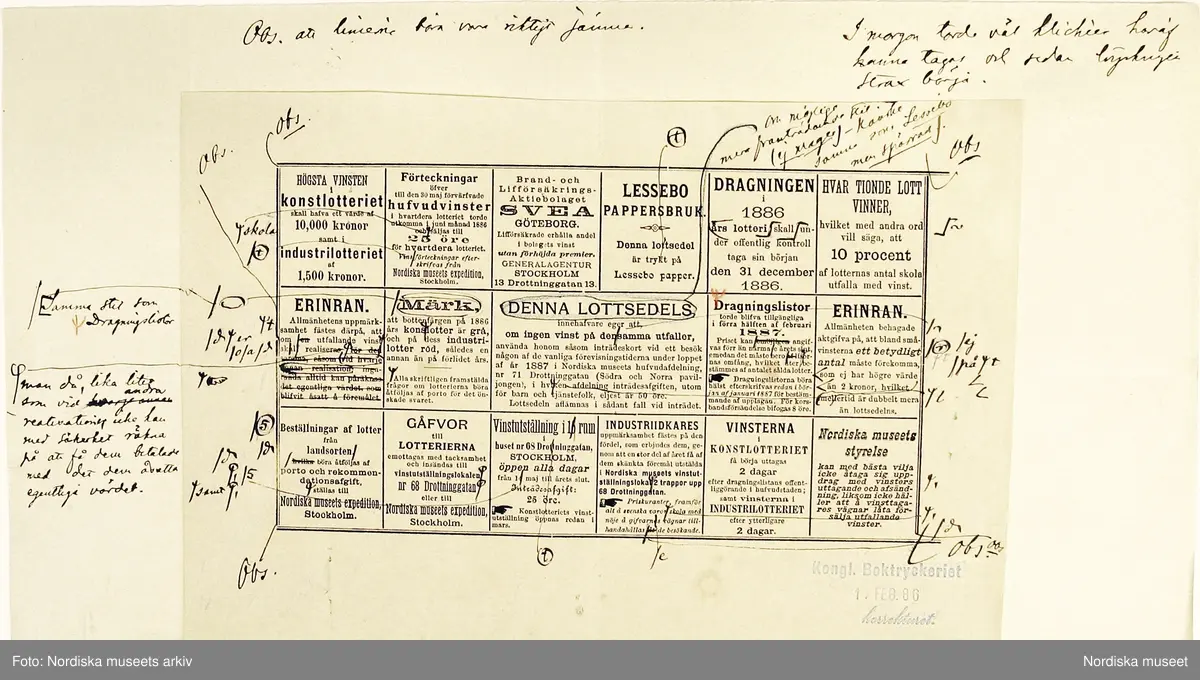 Korrektur till baksida på lottsedlar för 1886 års konst- och industrilotterier till förmån för Nordiska museet