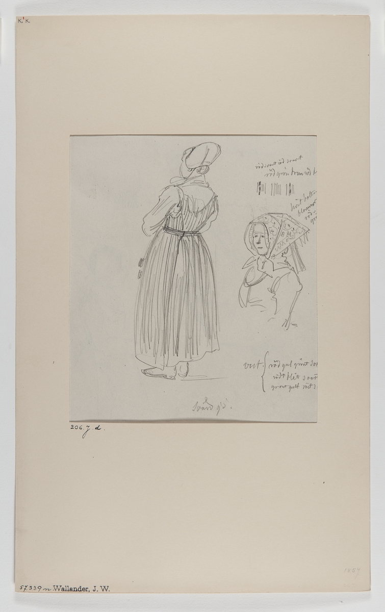 Handteckning av J W Wallander. Kvinnodräkt från Svärdsjö, Dalarna. Nordiska museets inventarienummer 57339n.