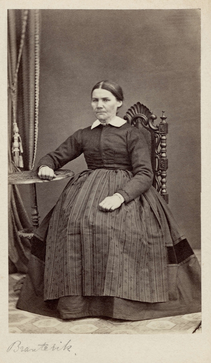 En kvinna poserar i en folkdräkt utan huvudbonad